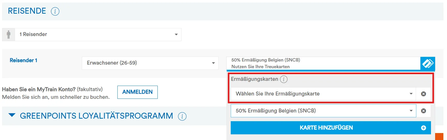 Die SNCB verkauft online Fahrkarten mit FIP 50 Rabatt. Dazu einfach bei den Reisenden die Ermäßigung “50% Ermäßigung Belgien (SNCB)” auswählen. Hier können auch mehrere Ermäßigungen, z. B. ein gleichzeitig noch vorhandener Freifahrtschein für die CFL (Luxemburg) oder NS (Niederlande) angegeben werden.