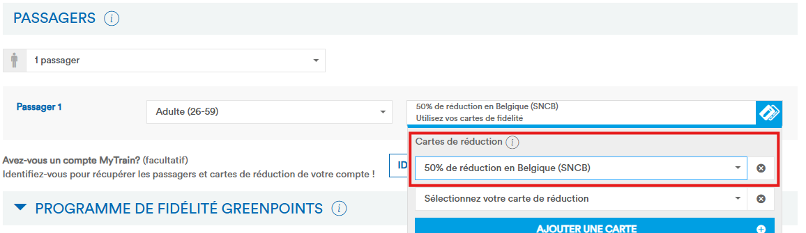 La SNCB propose la vente de billets en ligne avec la réduction FIP 50. Il suffit de sélectionner la réduction « 50% de réduction en Belgique (SNCB) » pour les voyageurs. Il est également possible de combiner plusieurs réductions, par exemple un coupon FIP valable simultanément pour le CFL (Luxembourg) ou NS (Pays-Bas).